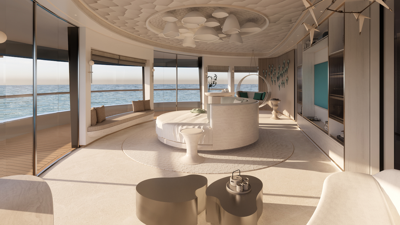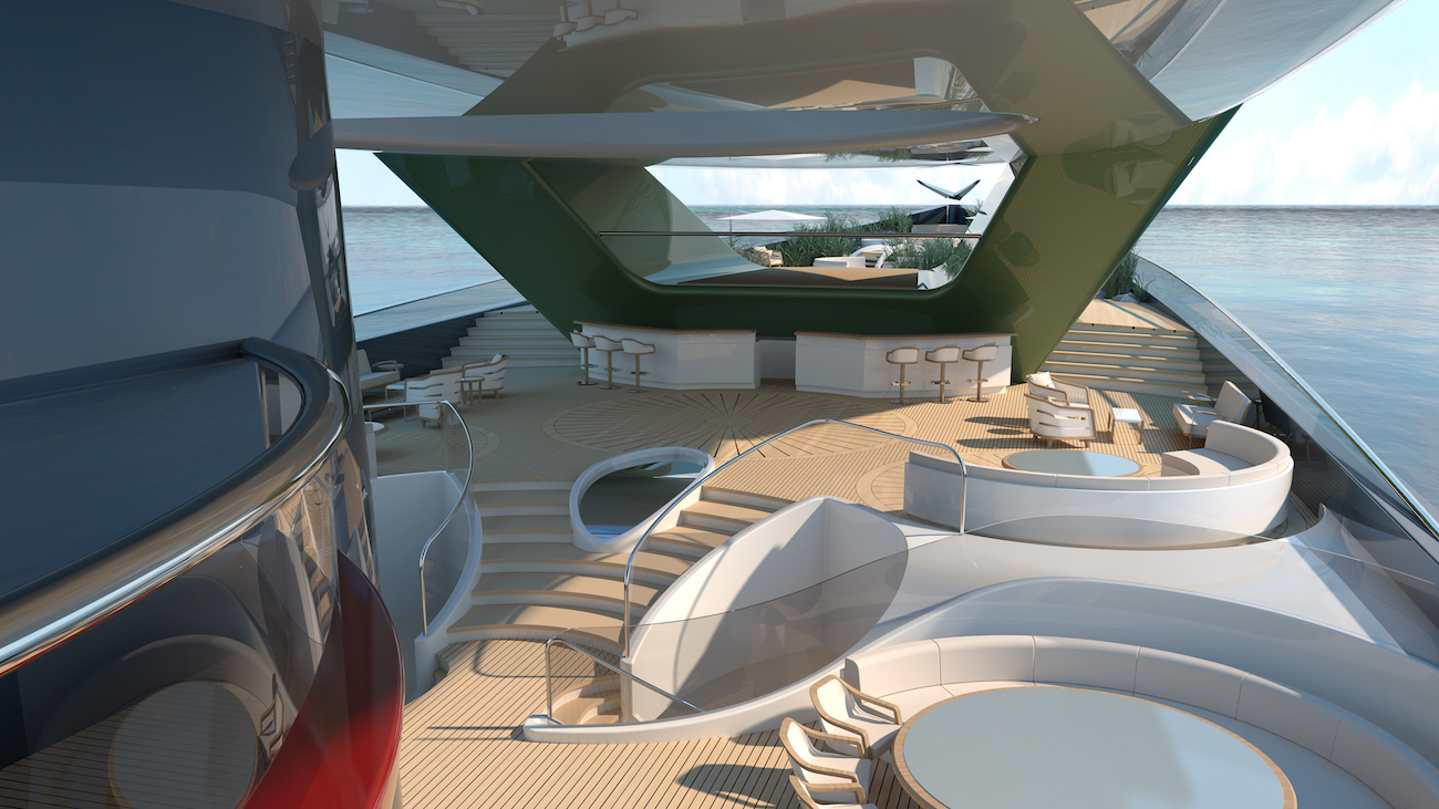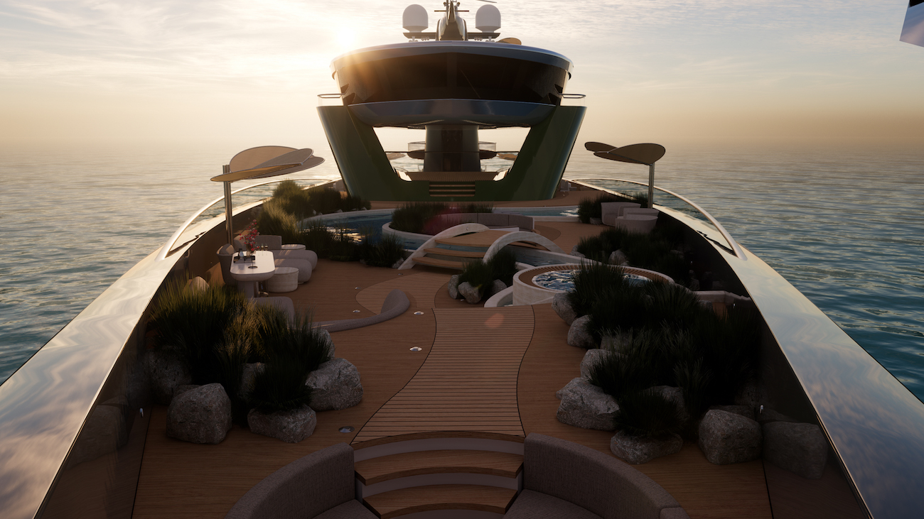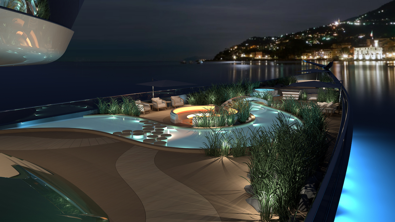 The natural world comes aboard with the ponds and park-like surroundings designed for the foredeck, while the interior is composed of living walls that create its own ecosystem, scenting the air with fresh and natural fragrance. The traditional teak decking is replaced by fast-growing, organically farmed wood that meets the same high-quality standards for performance and finish that Lürssen clients always expect.