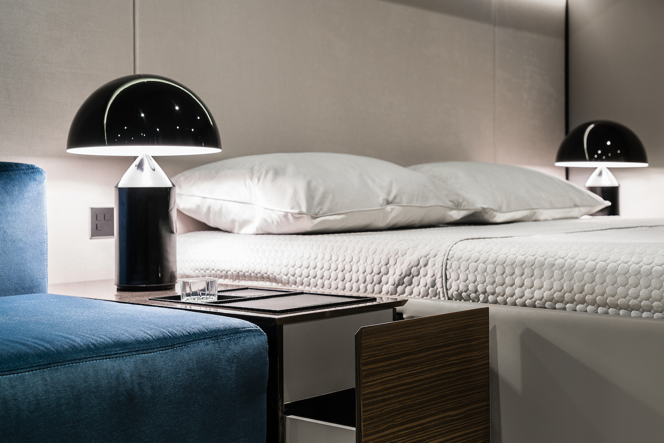 The main saloon features genuine oak for the flooring, ebony veneer and designer furniture pieces creating a contemporary ambience. The saloon features huge sofas and modular backrests, wine coolers, a dining table for eight which can be transformed when needed, a coffee bar and a 55’’ retractable TV.