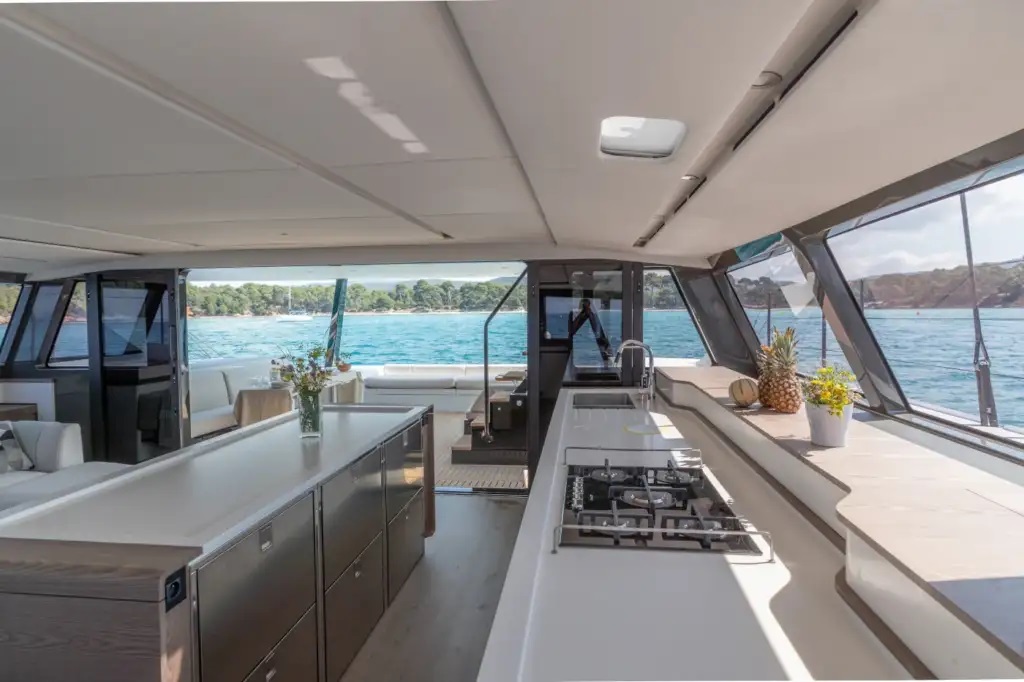 Built in 2023, she is a 22.00m (72′ 2″) Gunboat 72 with accommodation for up to eight guests in four luxury suites and a contemporary open plan salon and galley, perfect for families or friends looking for a sociable entertainment space. The décor is sophisticated and neutral, appealing to a wide range of charter groups.