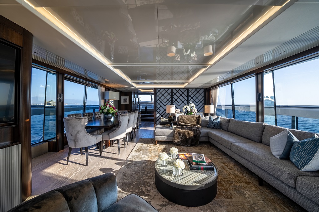The beautiful interior blends plush fabrics, warm grey tones and loads of light from the panoramic windows to create a welcoming atmosphere for guests. When the aft doors are open the main salon ad cockpit create a sociable space with great indoor and outdoor flow.