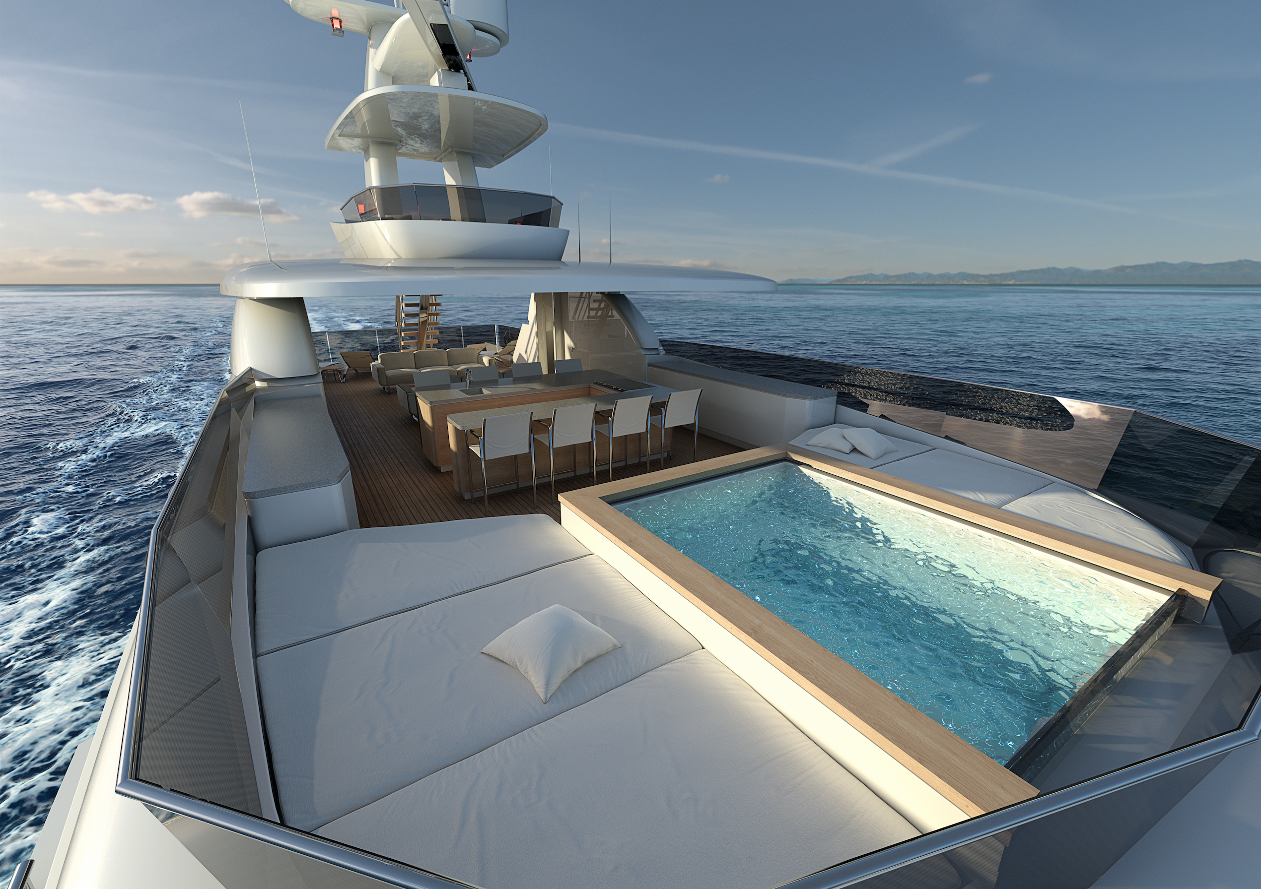 Luxury accommodation is provided for up to ten guests in five staterooms. All cabins are en-suite, lit with natural light, thanks to oversized windows and potholes. Crown’s nest and the sundeck with a beach club and a pool are among the most beautiful spots on board the superyachts. Interior design of Atlas is yet to be developed.