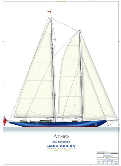 Superyacht Athos is the largest two-mast schooner ever built. She is designed by Andre Hoek and built by Holland Jachtbouw. The carbon masts are manufactured by Rondal and the standing rigging by SmartRigging. She carries the biggest lightweight rigging package yet supplied in the world. Compared to rod rigging, it saves the weight of four Mini Cooper cars at the height of the first spreader. A total of 5.500 kilometres of fibre has been used for the standing rigging.