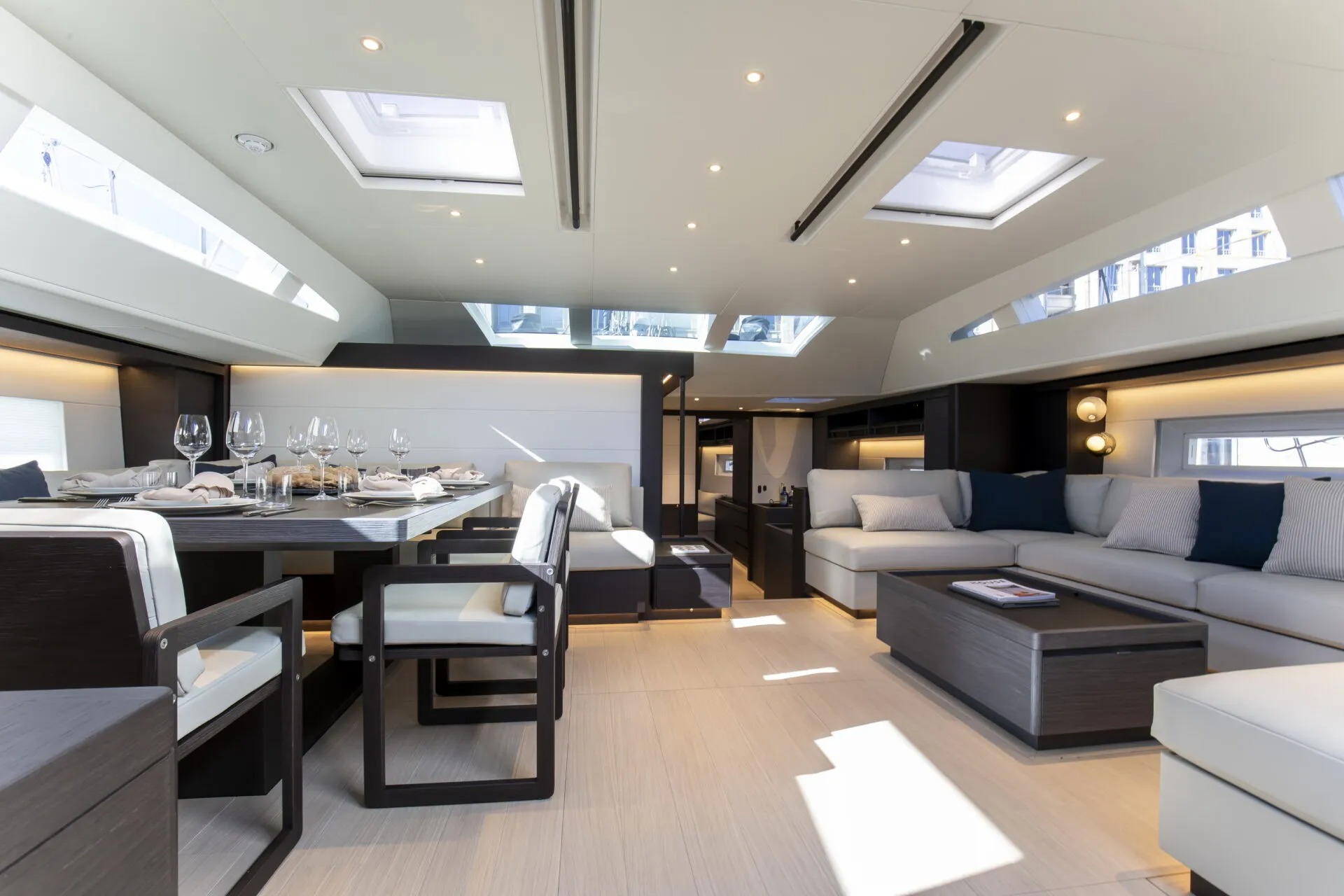 The outdoor spaces provide a large cockpit fitted with seating and drinks tables on both sides for dining alfresco. Two double sunbeds are immediately behind, and space forward and aft can be used for exercise, observation or additional sunbathing and lounging while at anchor.