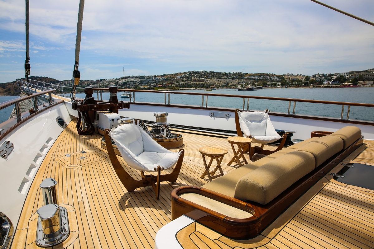 The deck is designed for outdoor living and guests will be spoiled for choice for places to sit and watch the changing scenery: The foredeck provides a quiet retreat for those looking to spend time with hobbies and rest in the sunshine, while the spacious aft deck cockpit can be shaded or opened up for guests to dine and relax in the utmost comfort while watching sports on the TV by the bar. Along the stern, the sunpads are the perfect place to to take a nap in the fresh air and warm afternoon sun of such destinations as Turkey or Greece.