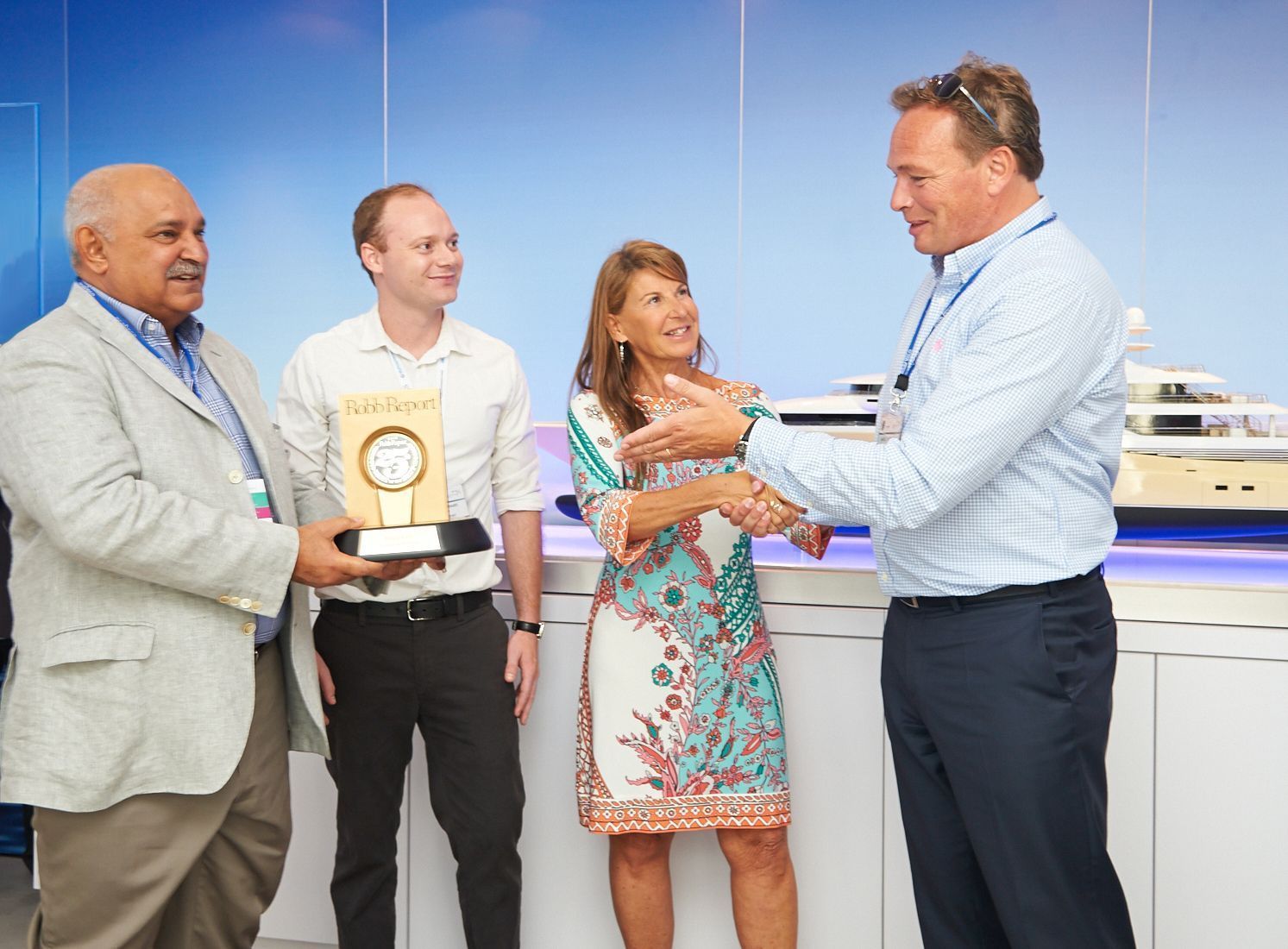 Oceanco is pleased to announce that its recent launch, luxury superyacht NIRVANA was awarded the prestigious 2013 Robb Report Award for the “Best of the Best” in the Megayachts category. September 25th at the Monaco Yacht Show saw Robb Report’s Worldwide Marine Director, Jody Dunowitz, and Associate Editor, Bailey Barnard, present the award to Oceanco Chairman, Dr Mohammed Al Barwani, and CEO Marcel Onkenhout.