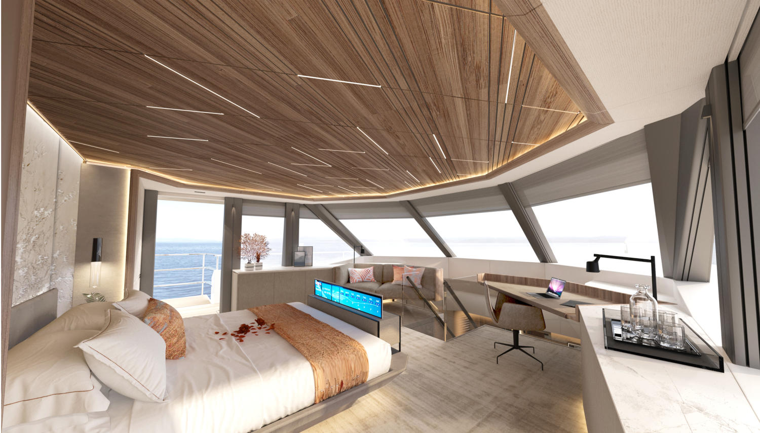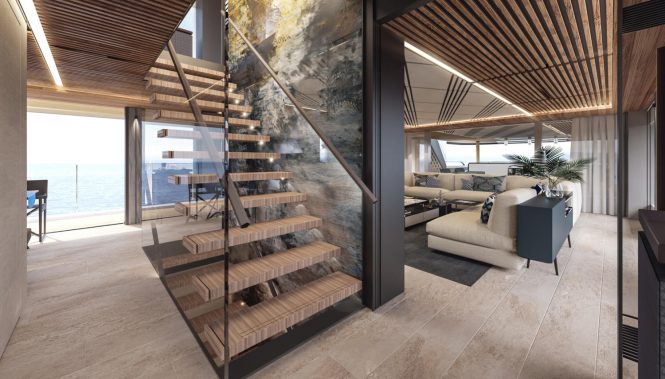 Comfort, space, luxury, privacy and stability at sea were all key factors for the indoor and outdoor living areas, such as the spacious lower deck swim platform where guests can sunbathe beside the water or use the area as an alfresco extension to the beach club lounge.