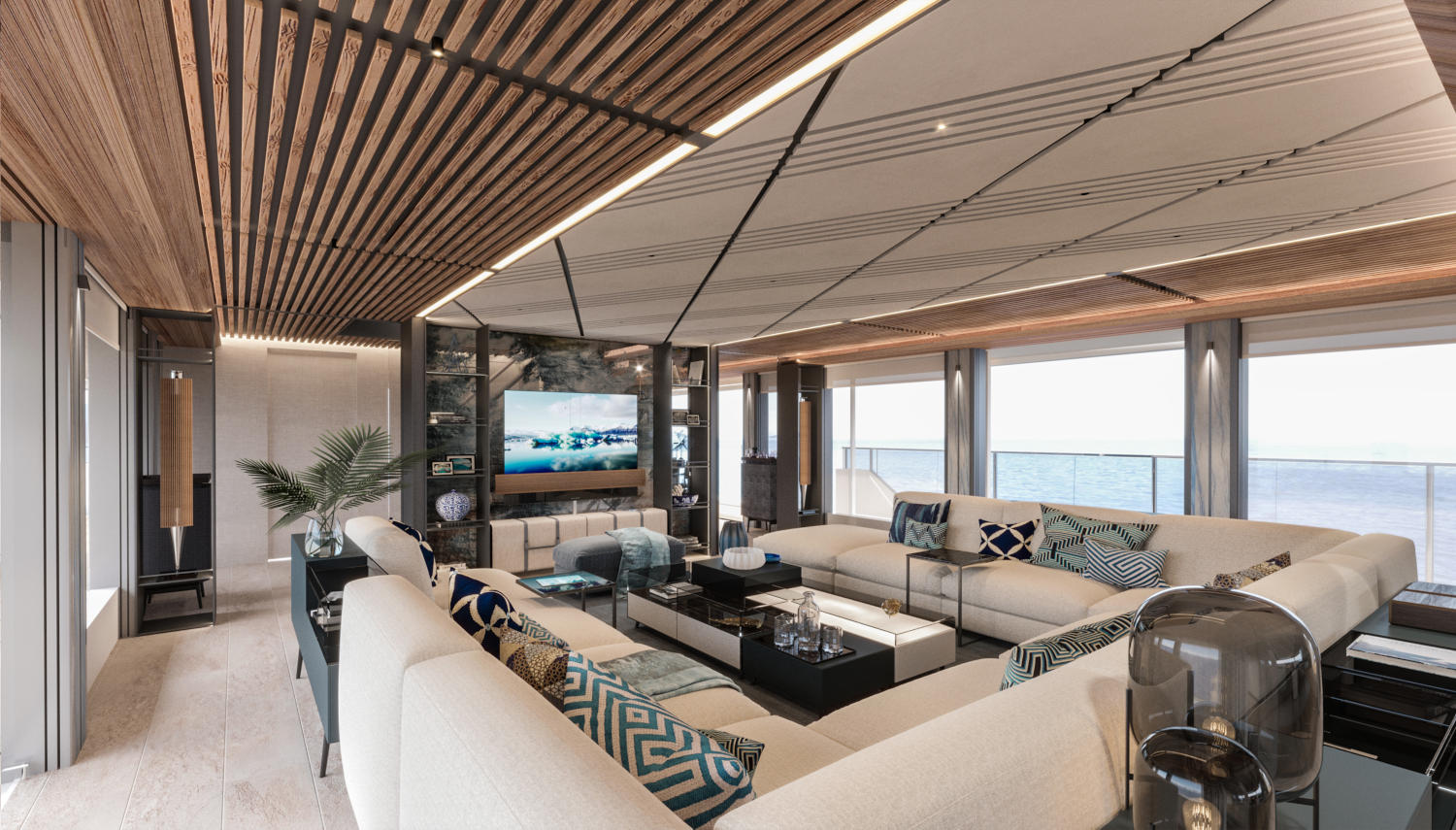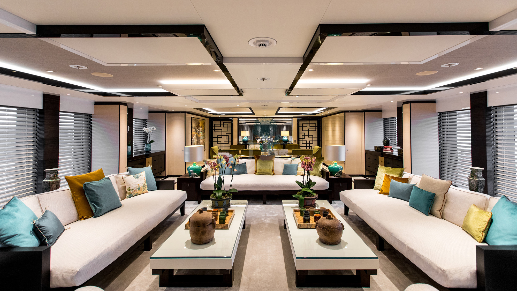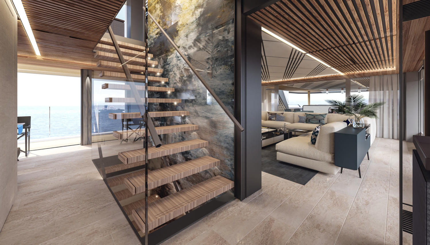 The interiors are modern and fresh in their appearance and connect their inhabitants with nature through the use of natural materials and neutral colours. Glass bulwarks and floor-to-ceiling windows provide excellent views of the surroundings, with a drop-down bulwark near the formal dining area creating a balcony for after-dinner drinks and viewing.