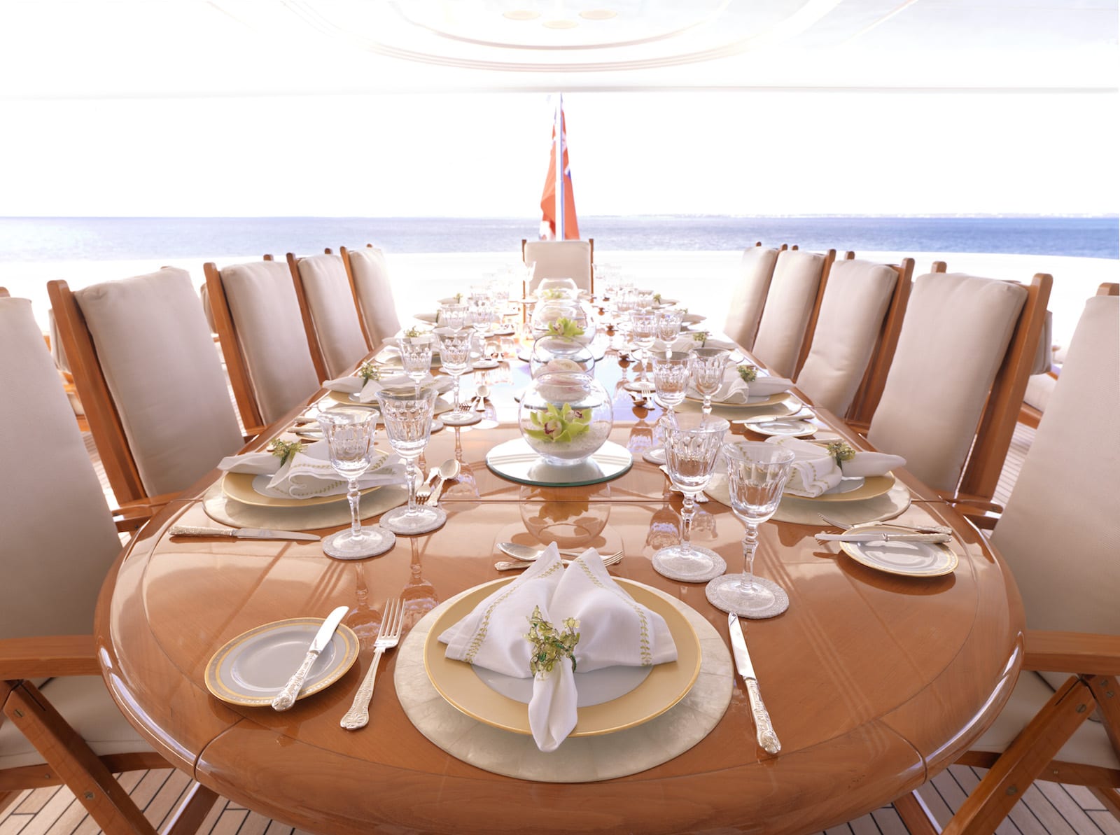 Luxurious dining set up aboard APOGEE available in the Caribbean and Mediterranean