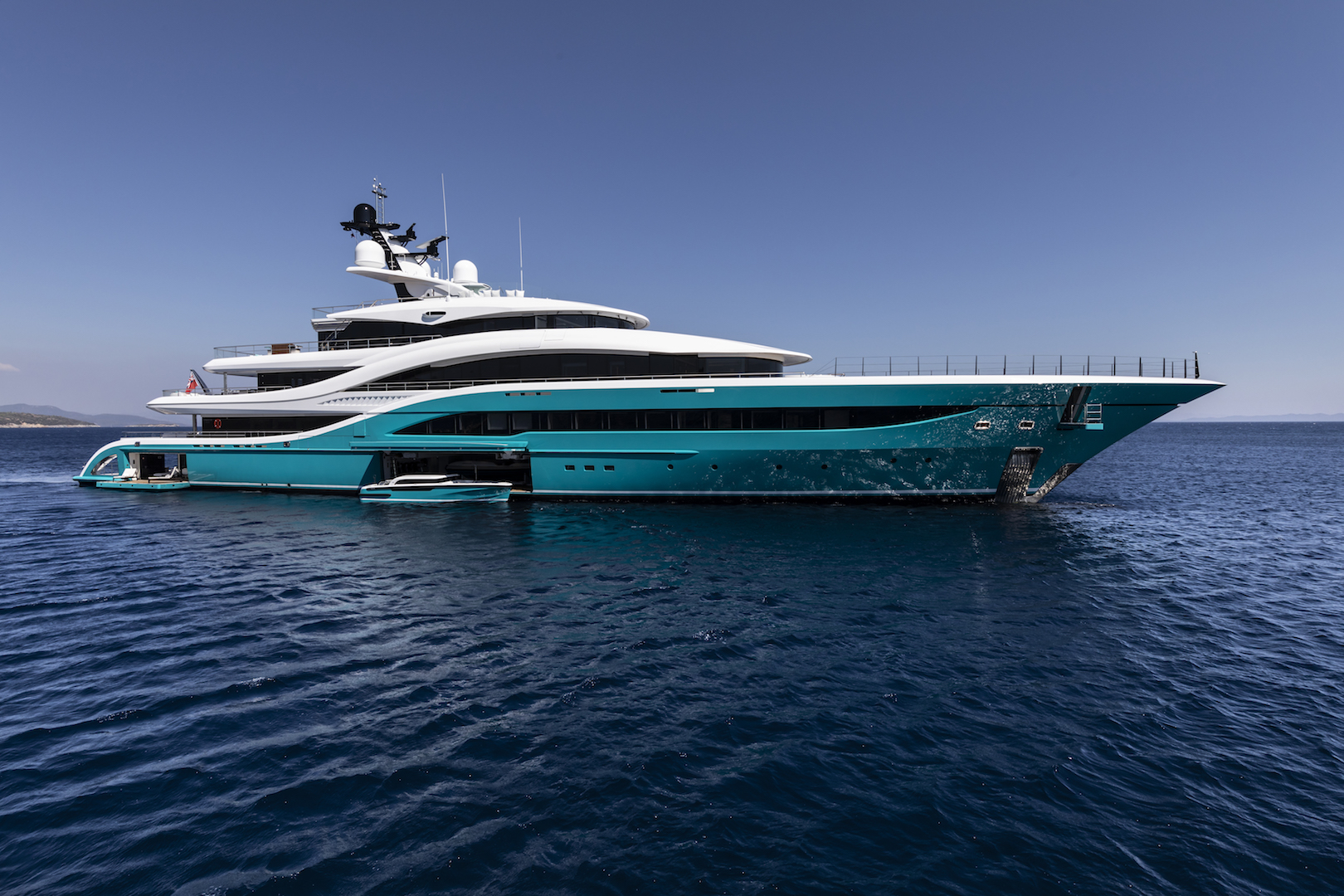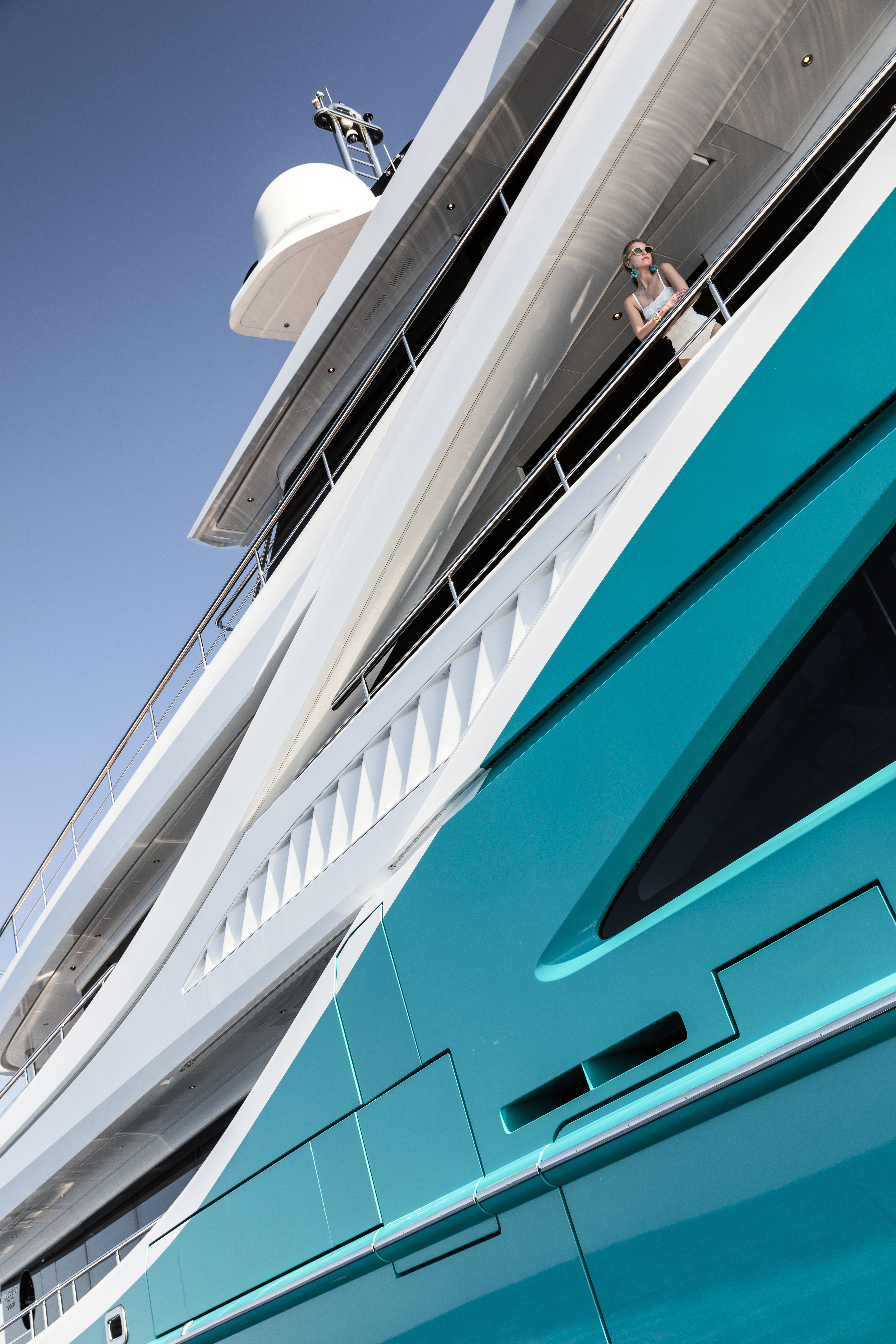 Delivered to her Owner in June this year, azure-hulled luxury yacht GO has an eye-catching contemporary appearance that uses curving bulwarks to create a smooth visual transition between the upper foredeck and the main deck below. Pure white lines run from the rim of the bow along the decks and down the sides of the beach club.
