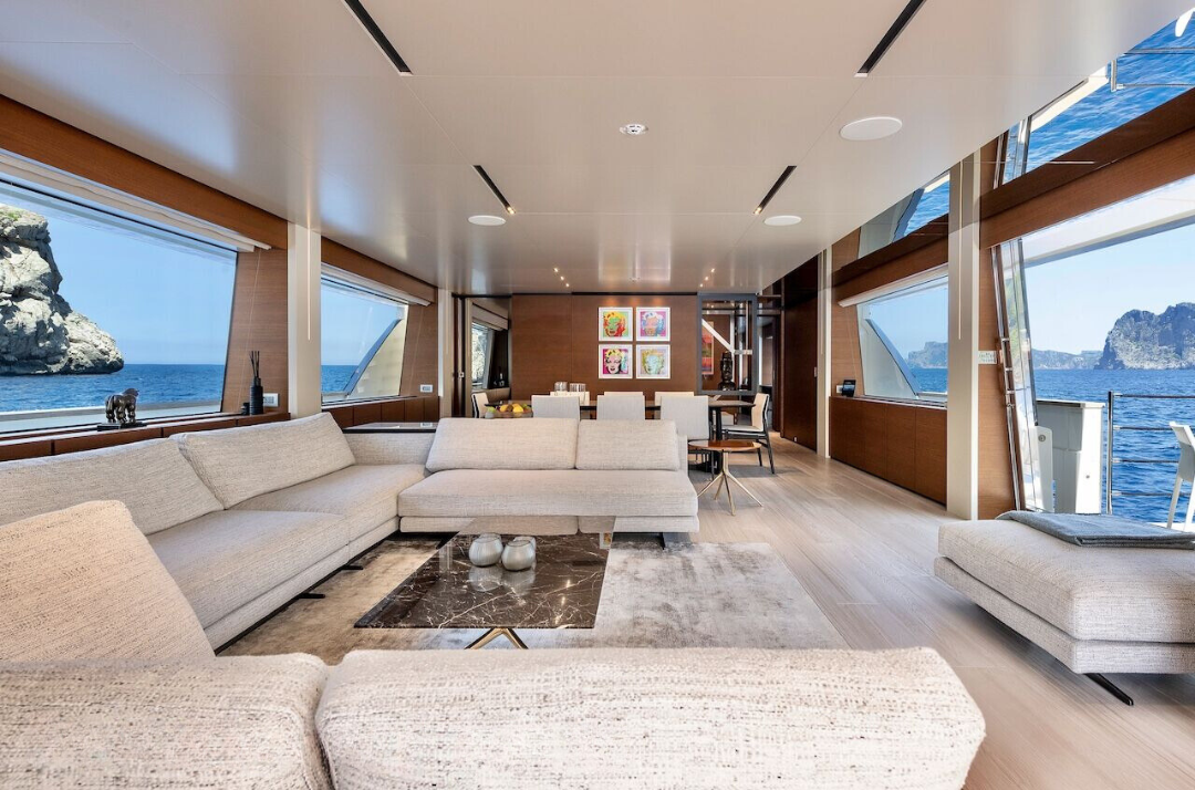 The contemporary feel continues inside, where modular sofas create flexible lounge areas in both the sky lounge and main salon. The neutral décor and expansive windows bring a light and welcoming atmosphere if guests choose to relax inside.