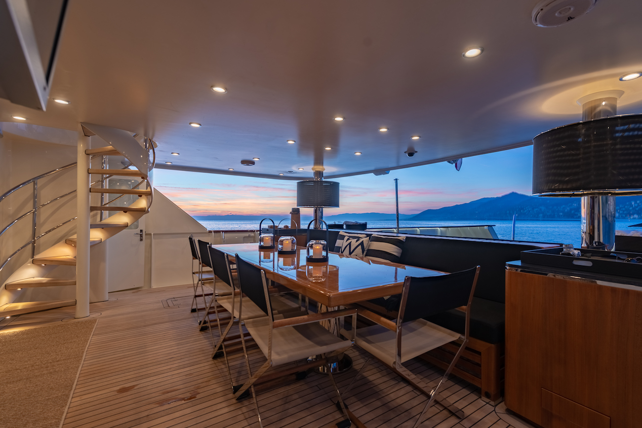 A greater connection has been created between the upper deck aft and the skylounge by replacing the previous door and surrounding windows with a full-beam pantograph door that can be folded completely for free-flowing access between the two spaces. To this end, the skylounge flooring has also been replaced with teak. Also of note is the extended fixed bimini to provide shade and ensure that the whole outdoor space is usable even in less clement weather conditions.