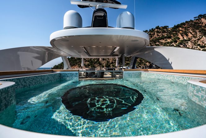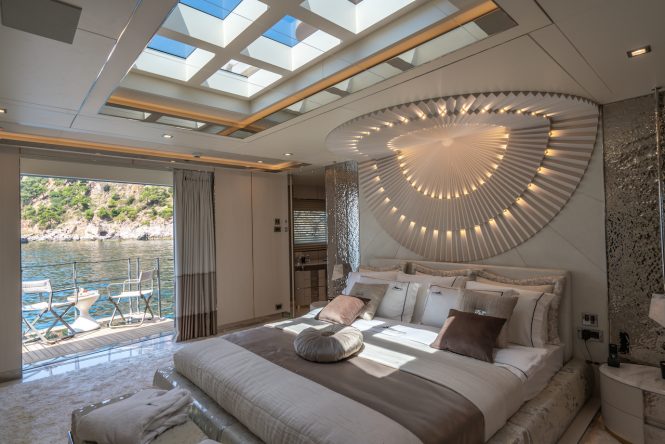 The general arrangement and interior styling was produced by H2 Yacht Design, who chose a light and airy colour palette in cool white accompanied by accents in warm brass and gold. The staircase is designed to reflect the light filtering through the Jacuzzi above, while in the Master suite a large skylight gives views of the blue skies or stars from the king-sized bed. In addition to the Master suite, the four other guest cabins have specially-designed headboards, lighting and other features, and the marble bathrooms add a spark of colour to the otherwise monochromatic surroundings.