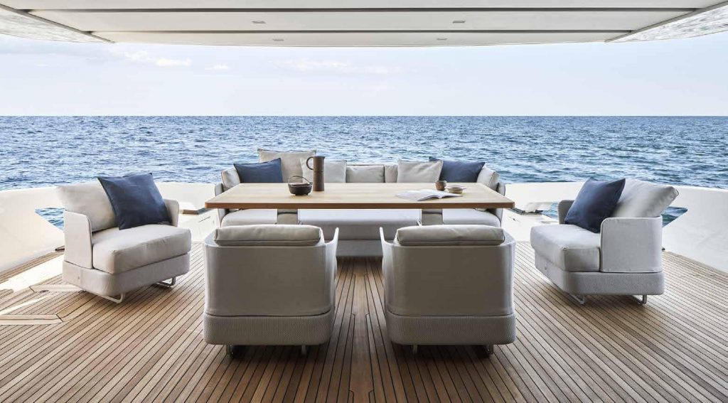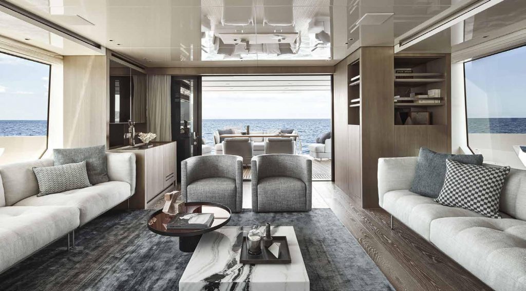 When you want to feel the sun and the summer breeze on your skin, there are plenty of alfresco dining and lounging areas to choose from, and sun loungers line the flybridge stern while the deep swim platform lets the group unwind close to the water’s edge.