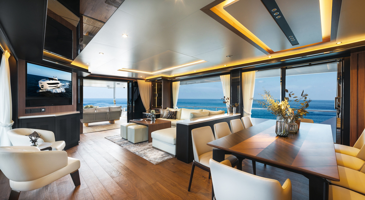 A plain white hull and superstructure are divided by dark floor-to-ceiling windows, which from the inside offer panoramic views and an abundance of natural light. The decor combines rich warm tones in satin walnut with golden lighting and pale Cambria stone for a sophisticated effect.
