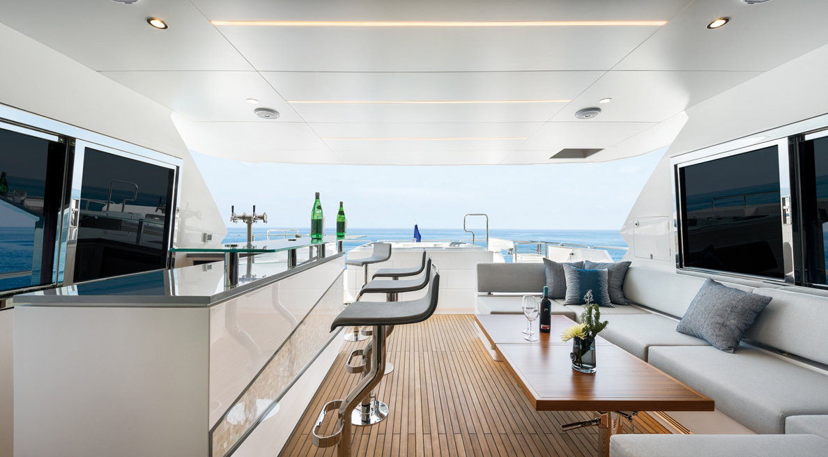 The outside areas give guests plenty of opportunity to unwind in comfort and enjoy the views: The main deck aft surrounds the coffee table with sofa seating for a place to rest and have lunch and drinks from the bar after a morning spent playing on the water toys. The foredeck is fitted with a broad sunbed, and the bridge deck aft comes with a Jacuzzi, a wet bar finished in mother-of-pearl, a widescreen TV and cosy corner lounge to unwind with the views at any time of the day.