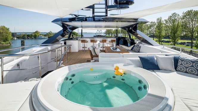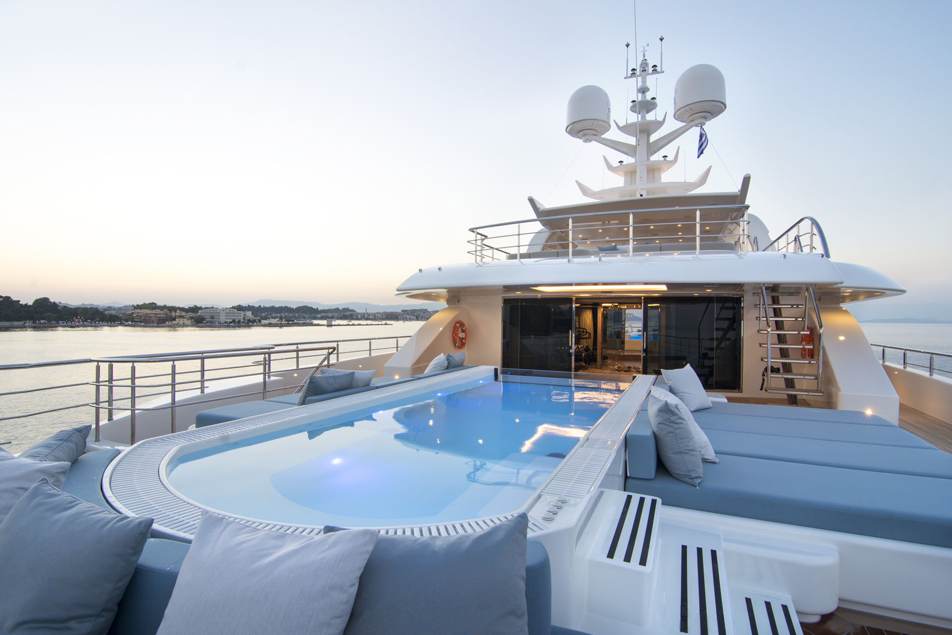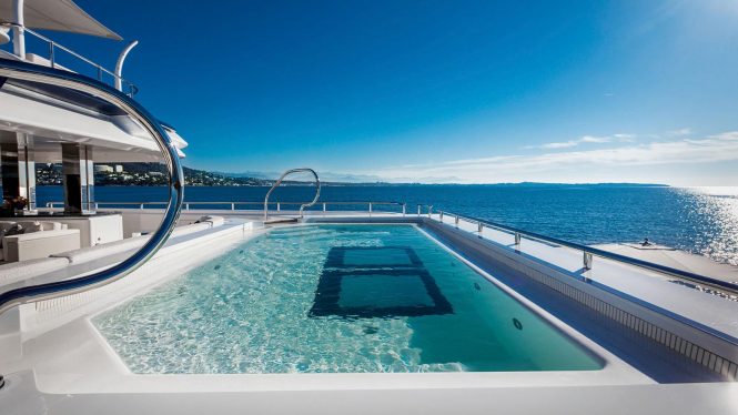The award-winning superyacht CLOUD 9 boats head-turning exterior and contemporary, elegant interiors by Winch Design with naval architecture by Zuccon International Project. As for sunbathing areas she is fitted with a swimming pool, sun loungers and Jacuzzi – totally luxurious and perfect for enjoying the warm temperatures of Italy, Spain, France, Croatia and other Med hot spots this summer.