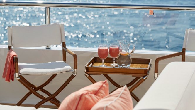 Exterior living aboard the M/Y JOY is very well-appointed, from her vast beach club to the sundeck and fitness gym. A generous aft deck has a bar, great seating areas, and outdoor cinema. The upper aft deck is the perfect social hub for charter guests to gather, boasting a generous indoor and outdoor lounge, and alfresco dining. Her 3rd deck includes a fully equipped fitness gym. The Sundeck is located on the top aboard this wonderful Feadship yacht and features numerous sun pads, seating, a BBQ service station and luxurious oversized jacuzzi.