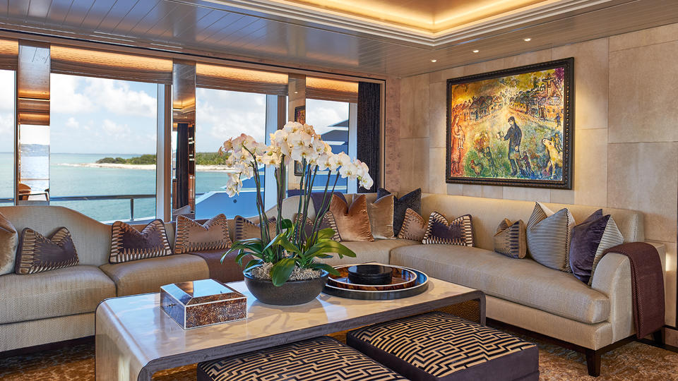 The yacht’s interior and exterior layout flows seamlessly with versatility, making her an exceptional choice. The main salon and upper sky lounge are elegantly appointed, with bespoke tones of luscious light golds and muted fabrics, creating an inviting yet unobtrusive ambience.
