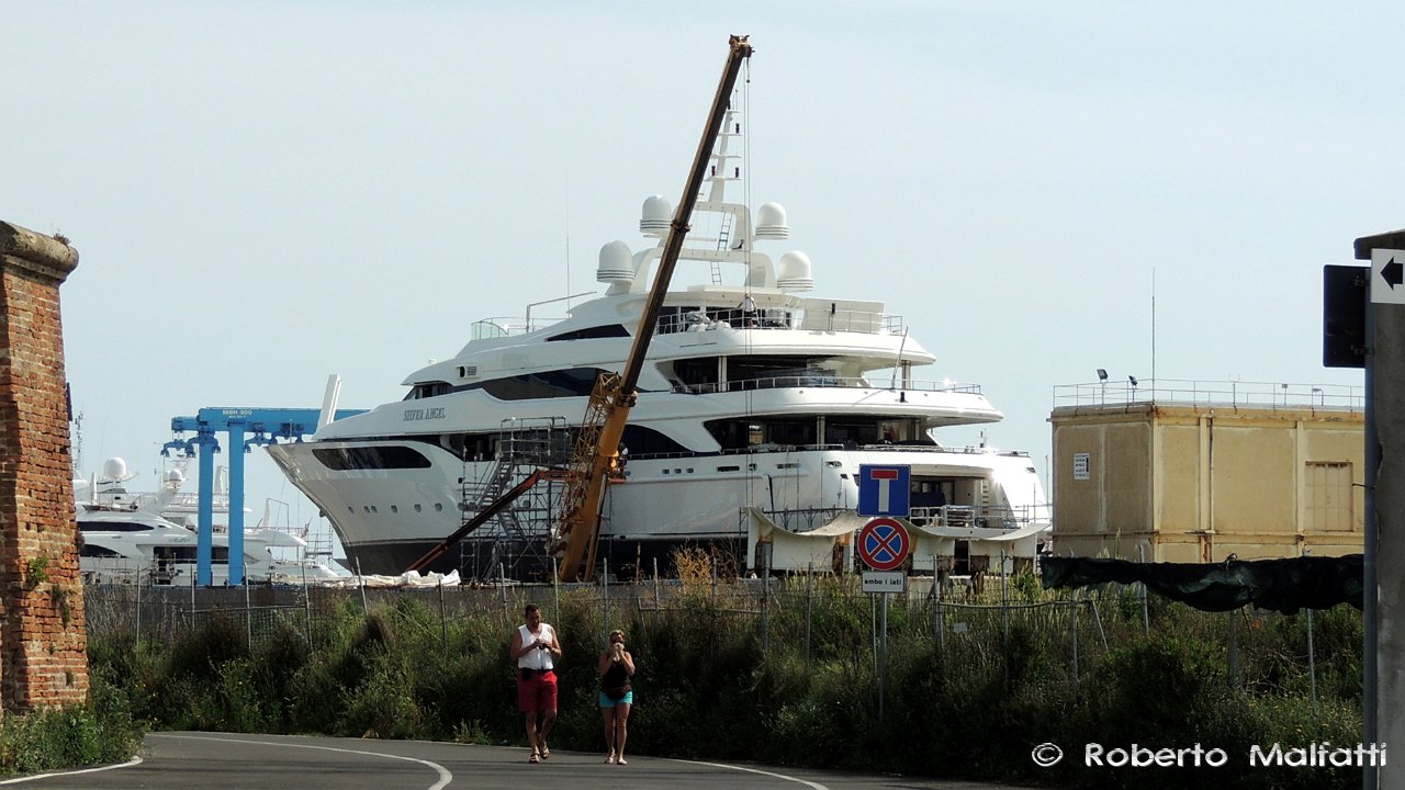 The majestic 65-metre mega yacht SILVER ANGEL was spotted by yacht enthusiast, Roberto Malfatti, at the Benetti shipyard in Livorno, Italy, on May 13, 2015. Launched by Benetti in 2009, luxury motor yacht SILVER ANGEL has been magnificently designed by Stefano Natucci, with interior design by Argent Design.