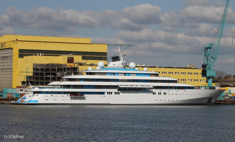 125m Lurssen Mega Yacht GOLDEN ODYSSEY (Project Tatiana) at the Lurssen shipyard in Germany on April 18, 2015 – Photo credit to DiFoo