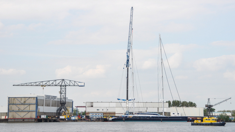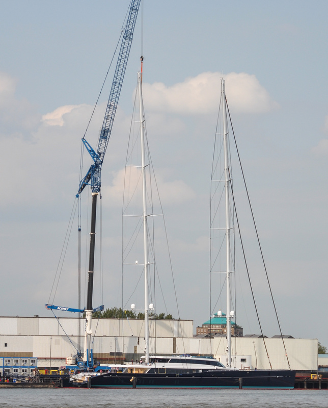 On Friday, May 8, 2015, both impressive 93m (305’) masts of the massive 86m mega yacht AQUIJO (Hull Y711/Hull 3069, Project 85) were successfully stepped at the Oceanco’s subcontractor Zwijnenburg premises, where the vessel will stay for final fitting out and sea trials. The photos below, made by Jan van Heteren, show the outstanding sailing yacht AQUIJO with masts stepped.