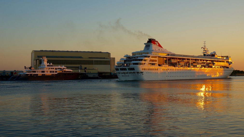 The photos below, taken by yacht photographer ‘DrDuu‘, show just how large motor yacht ICE is. The massive 90-metre mega yacht ICE (ex AIR) was photographed next to the Braemar cruise ship on the river Wesser in Bremen, Germany. Launched by the premier German builder Lurssen to a design by Tim Heywood in 2005, ICE features contemporary interiors by Terence Disdale, boasting a large amount of fine art pieces and bespoke furniture.