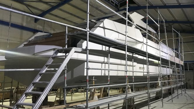 Mazu 82 flagship superyacht is nearing completion at the Turkish shipyard. Mazu Yachts reported that the outfitting stage is half completed, engines are installed and teak decking completed. The construction process is currently on schedule with delivery in 2020.