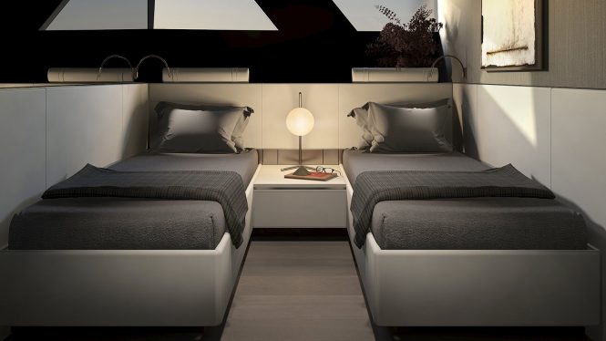 Three staterooms provide accommodation for up to 6 guests. The full-beam owner’s cabin is located amidships, while A VIP cabin is forward and a double stateroom is off the passageway.