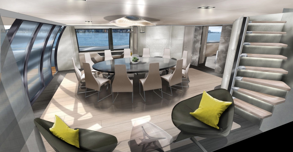 The owner’s suite will also have a walk-in wardrobe, an en-suite bathroom and a gym. Its upper deck location has the additional benefit of leading out onto a spacious private aft that can be used as a helipad.