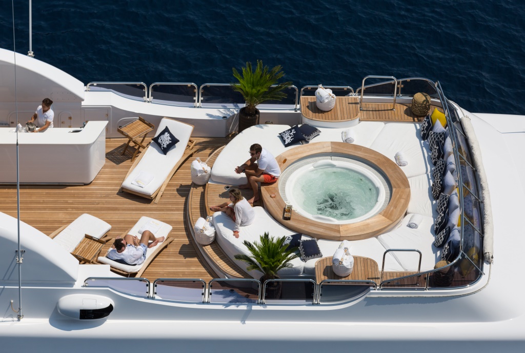 The sundeck offers excellent surroundings for unwinding in the summer sun: enjoy uninterrupted views of your Mediterranean destination as you soak in the Jacuzzi or relax on the comfortable sunpads and sun loungers.