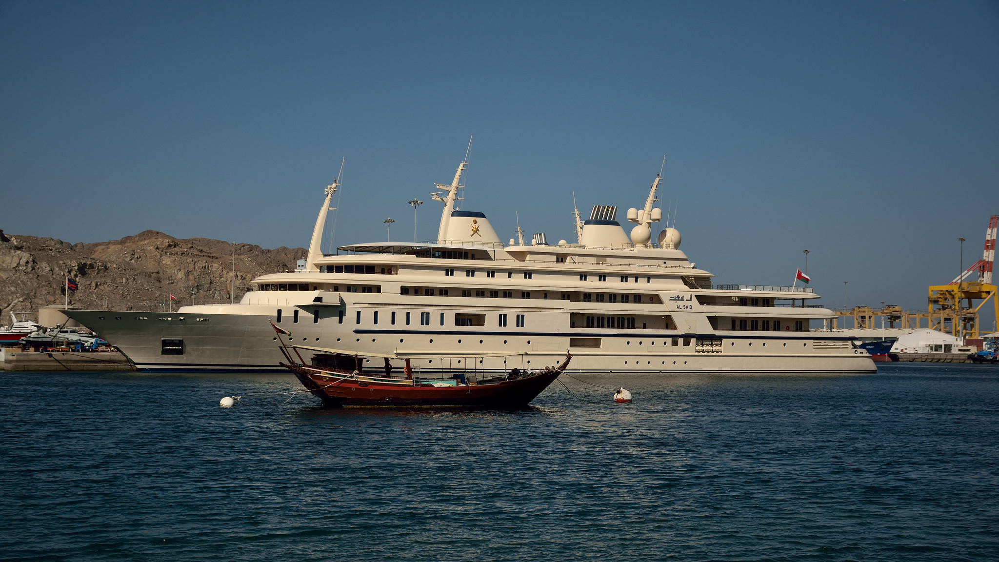 AL SAID, the fifths largest superyacht in the world, was spotted in Oman. The custom built yacht was ordered from bespoke shipbuilder Lurssen in 2006. This impressive 155-metre mega yacht features exterior styling by Espen Oeino, while her interior design is by Redman Whiteley Dixon. With launch in 2008, Al Said is able to reach a maximum speed of 25 kn and a cruising speed of 22 kn. Opulent accommodation on board is offered for up to 70 guests, assisted by 154 crew members. Al Said is owned by the Sultan Qaboos of Oman.