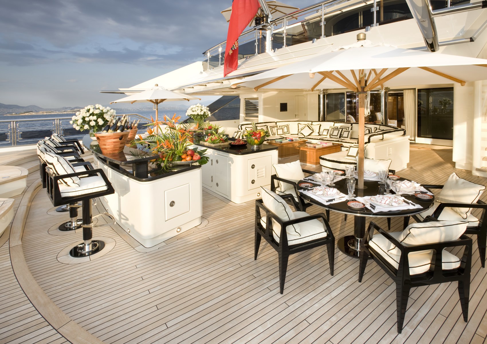 - Private Owner’s deck with Jacuzzi, dining area, and sunpads