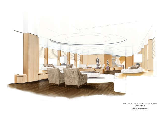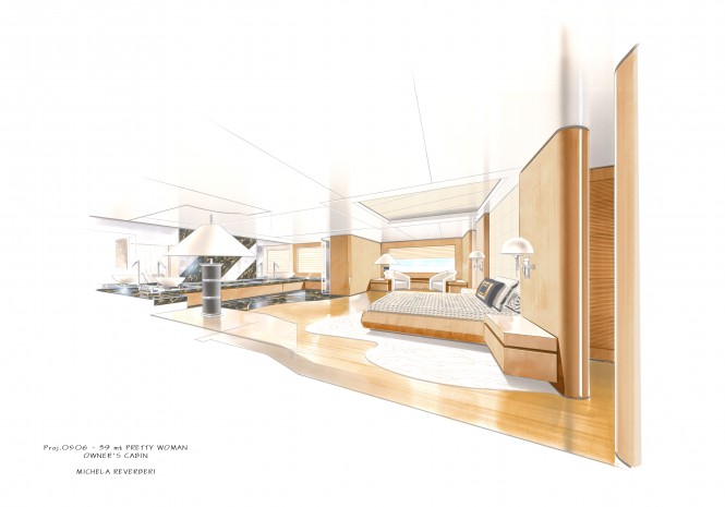 Michela kindly provided us with additional renderings of her works, including the Hakvoort built 39 metre luxury motor yacht Snow Bird (ex Pretty Woman), which was launched in 2010. The renderings show Pretty Woman’s Main Salon and the Owner’s Cabin design proposals.