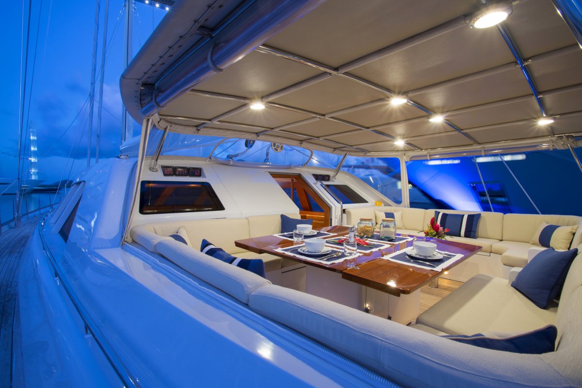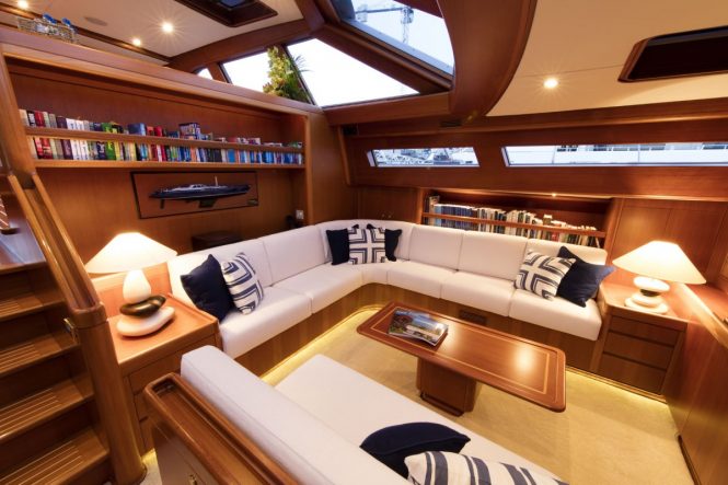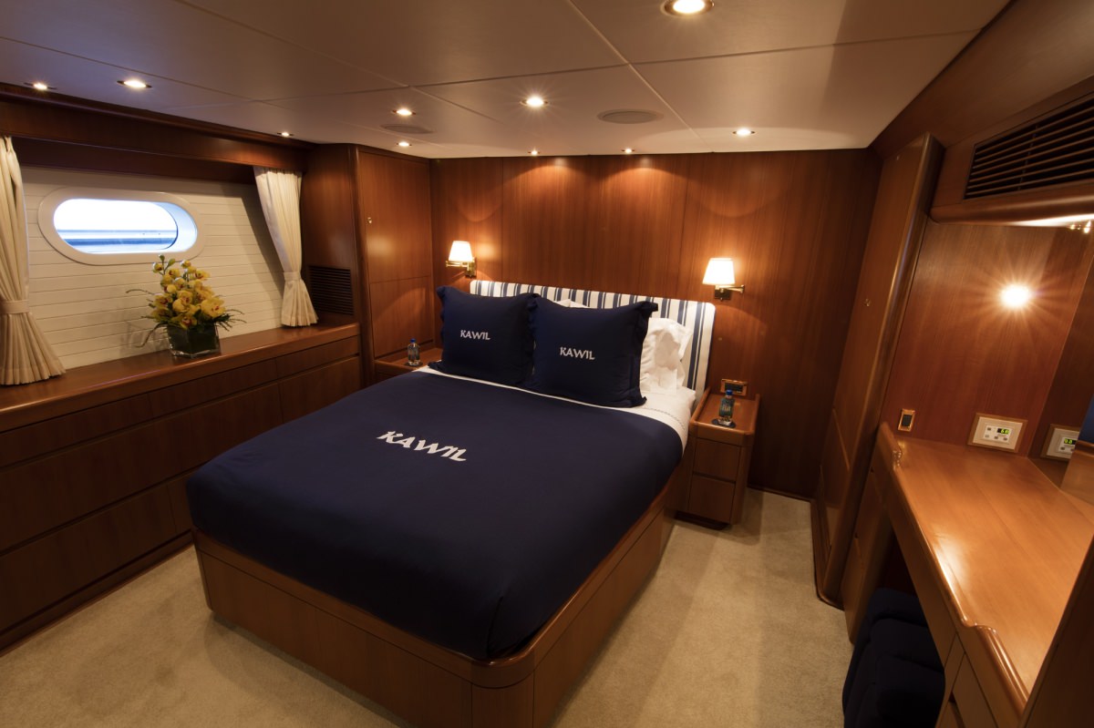 S/Y KAWIL has been impressively maintained since her launch, receiving refits in 2008 and 2014 to offer modern technology and comfort carefully integrated into timeless surroundings. The lower salon is a warm and intimate environment providing a TV lounge and a casual dining area for family meals in air-conditioned surroundings. The upper lounge receives an abundance of light through the surrounding windows and makes an ideal place for guests to rest with reading material, or for dining at the fold-out table.
