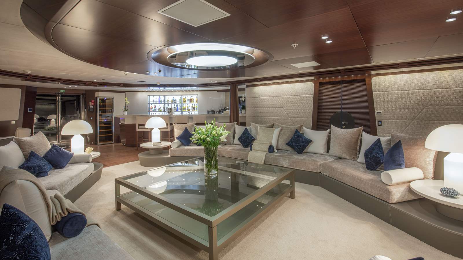 Mazing volumes of interior living offer plenty of entertaining options. A generous main salon offers a sumptuous lounge, a complete wet bar and even a piano. Forward to the salon is a formal dining area. A separate gentleman cigar room is forward, with a fitness gym adjacent. Located on the upper deck are 2 master staterooms forward of the vessel, plus a further 4 cabins aft, each of which has a private fold-out balcony.