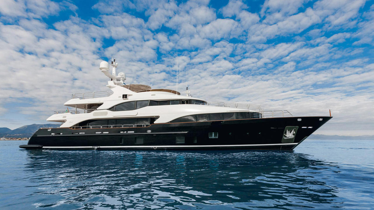 The yacht’s interior décor is timeless with a lovely elegant ambience. A large salon features 2 sections, the aft with plush sofas and bar, while forward is a lounge with entertainment systems. Surrounded by rich cherry toned woods and panoramic windows, space invites a relaxed, yet elegant feel. Situated forward on the main level is the forward-facing master stateroom, which boasts his and hers facilities, a study and private dressing room. Aft on the bridge deck is a generous sky lounge, wet bar and semi-alfresco dining, that encloses to create a stunning formal arrangement. Additional accommodation is located on the lower deck, comprising 3 double and 1 twin cabin.