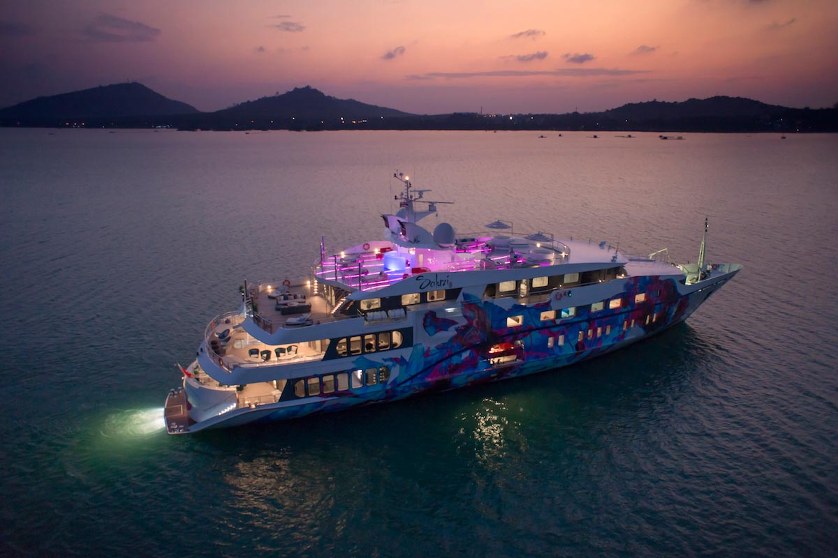 The yachts interior design is the creation of Luiz de Basto, offering a wonderful combination of vibrant colours, custom furnishings and bespoke pieces throughout. There are 3 vast interior living areas for socializing, all boasting an inviting ambience. The main deck comprises the dining area as well as a fun karaoke arrangement. Her upper deck has a generous main salon, while the bridge deck houses a private master stateroom lounge. All accommodation is above the waterline, in 2 master staterooms on the bridge deck, 6 amazing VIP cabins on the upper deck, 1 VIP, 3 double and 4 twin cabins on the main deck.