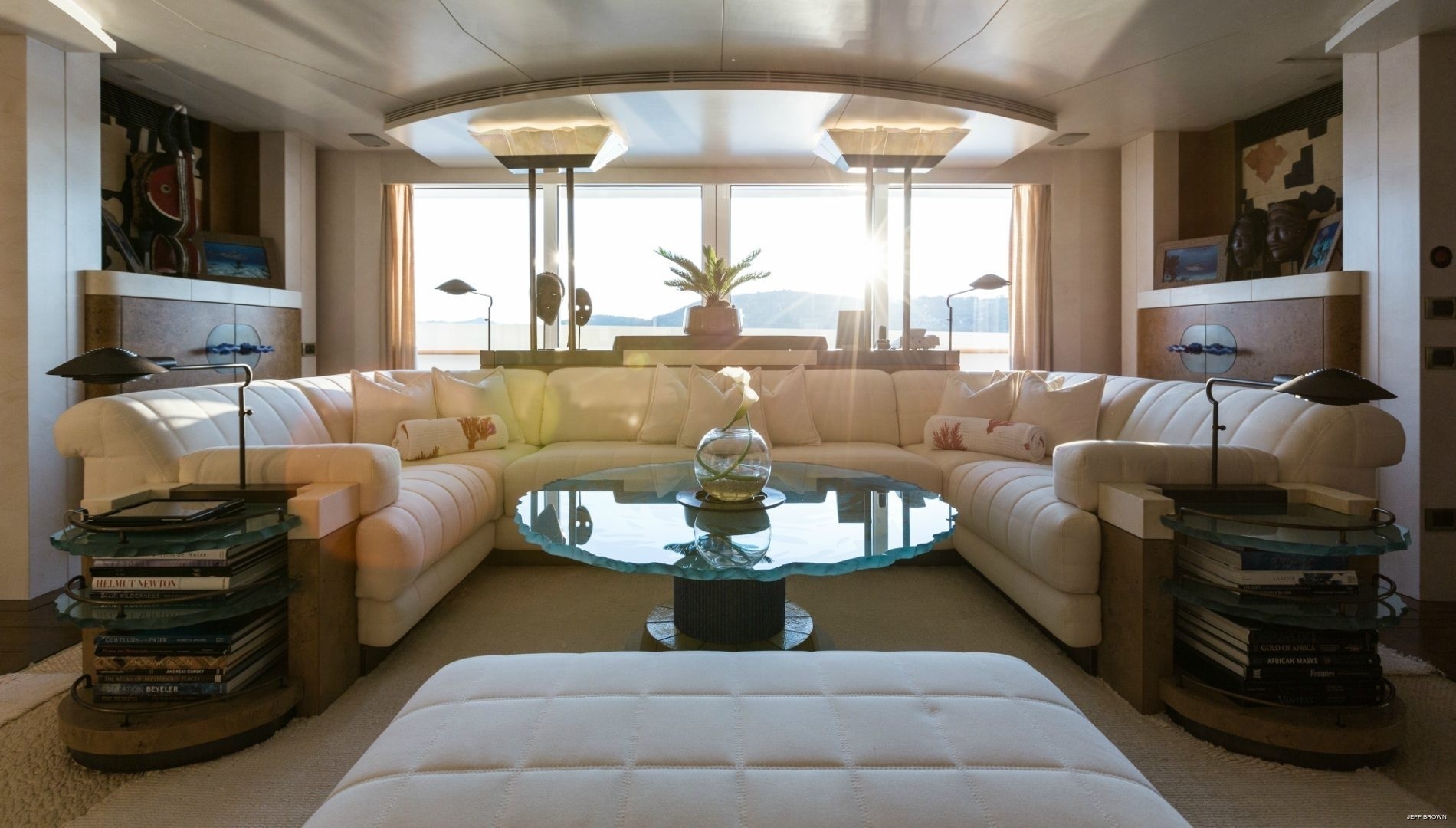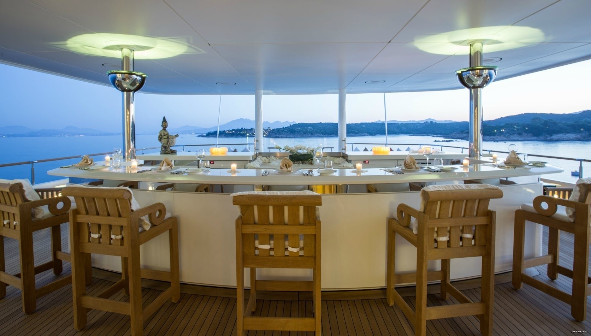 The top deck aft has a large breakfast bar and a generous selection of sunpads behind to start the day off in the sunshine. Above, the sundeck provides unparalleled views while guests relax in the plunge pool with counter-current, or sit back in the shade. There is an abundance of space for use as an entertaining space or outdoor exercises such as yoga and Tai Chi.