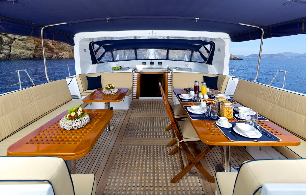 Accommodation comprises a full beam master stateroom forward, 2 double cabins also forward of the salon, and 2 twin cabins aft of the salon. All cabins have private en-suite facilities, while the 2 double cabins include a Pullman each.