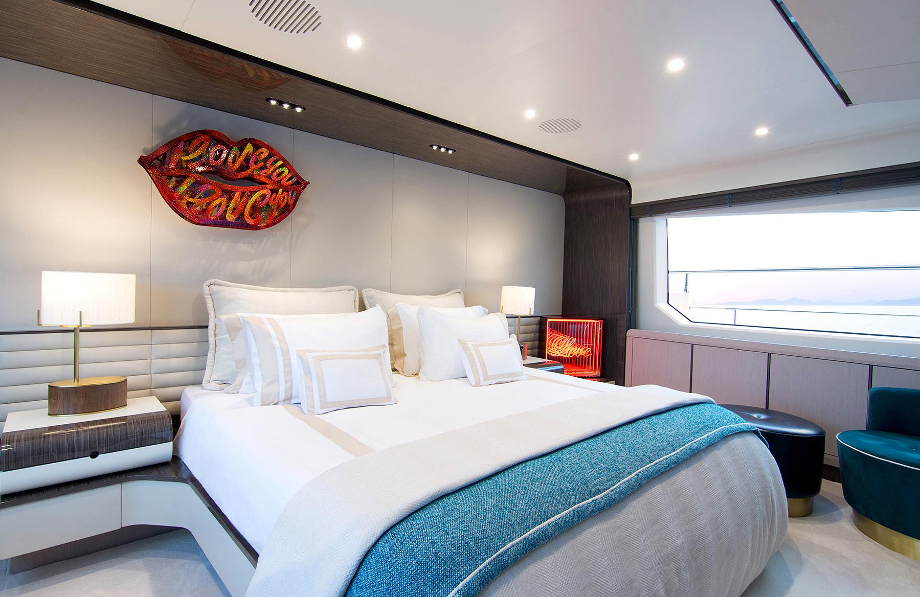 The stylish interiors are contemporary with a blend of sea blue furnishings and custom accessories. The salon is an open plan offering a generous lounge aft and dining placed forward. Her master stateroom is situated on the main deck and full beam of the yacht, while below decks are 4 further suites.