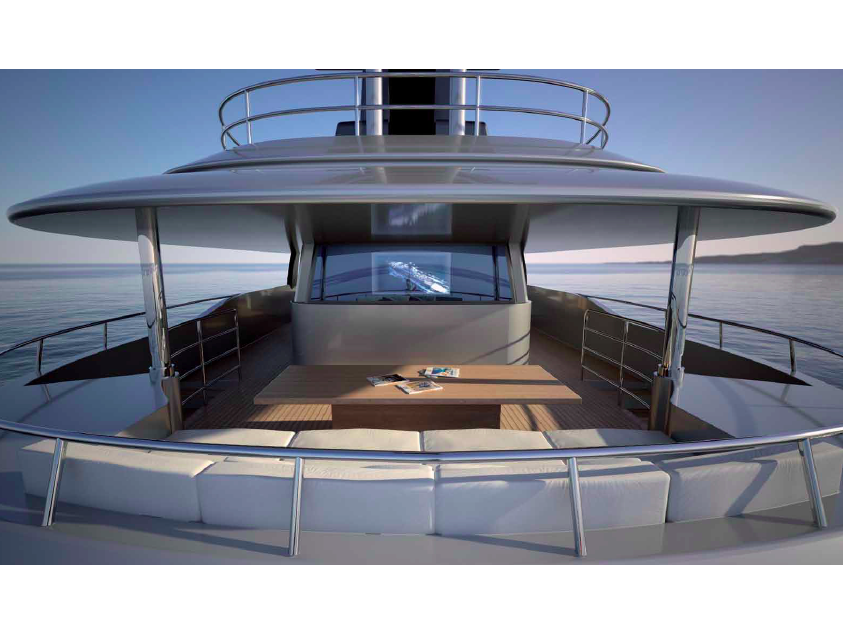 Some of the particularities of this concept include fold-down balconies situated next to the saloon, as well as fully openable aft deck doors for excellent indoor-outdoor flow.