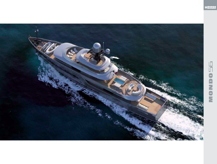 Measuring 56 metres (182’67”) in LOA, Mondo56 yacht has a beam of 9,80 m (32’15”) and a draft of 3,10m (10’17”). She is designed to be fitted with two MTU 12V4000M53 engines, powering her up to a maximum speed of 16 knots and a cruising speed of 14 knots. Her range of 5,000 nautical miles can be achieved at 12 knots.
