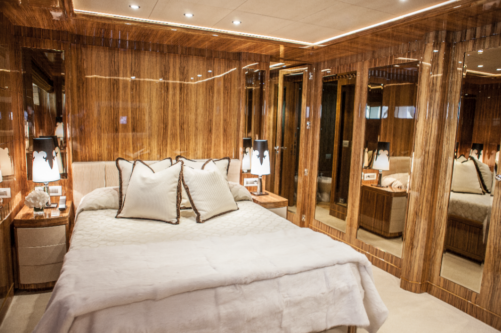 On the left hand-side the galley can be found, and on the right we find the ample Owner’s quarters featuring a relax area fitted with a comfortable chaise-lounge and a spacious wardrobe; The bathroom is characterised by precious marble and onyx back-lit surfaces.