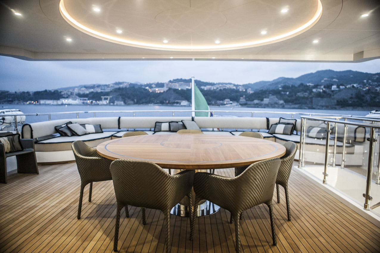 The external areas of OKKO are fully equipped and very comfortable, with furniture designed and crafted following the same care for quality and details applied to the interior. The upper deck’s rich soft furnishing and dining area décor have been skilfully designed in order to blend with the interior as an extension of it. The buffet bar and the convivial round table embellished with steel and teak finishing make this area just as perfect for a quick meal as for a formal gala event.