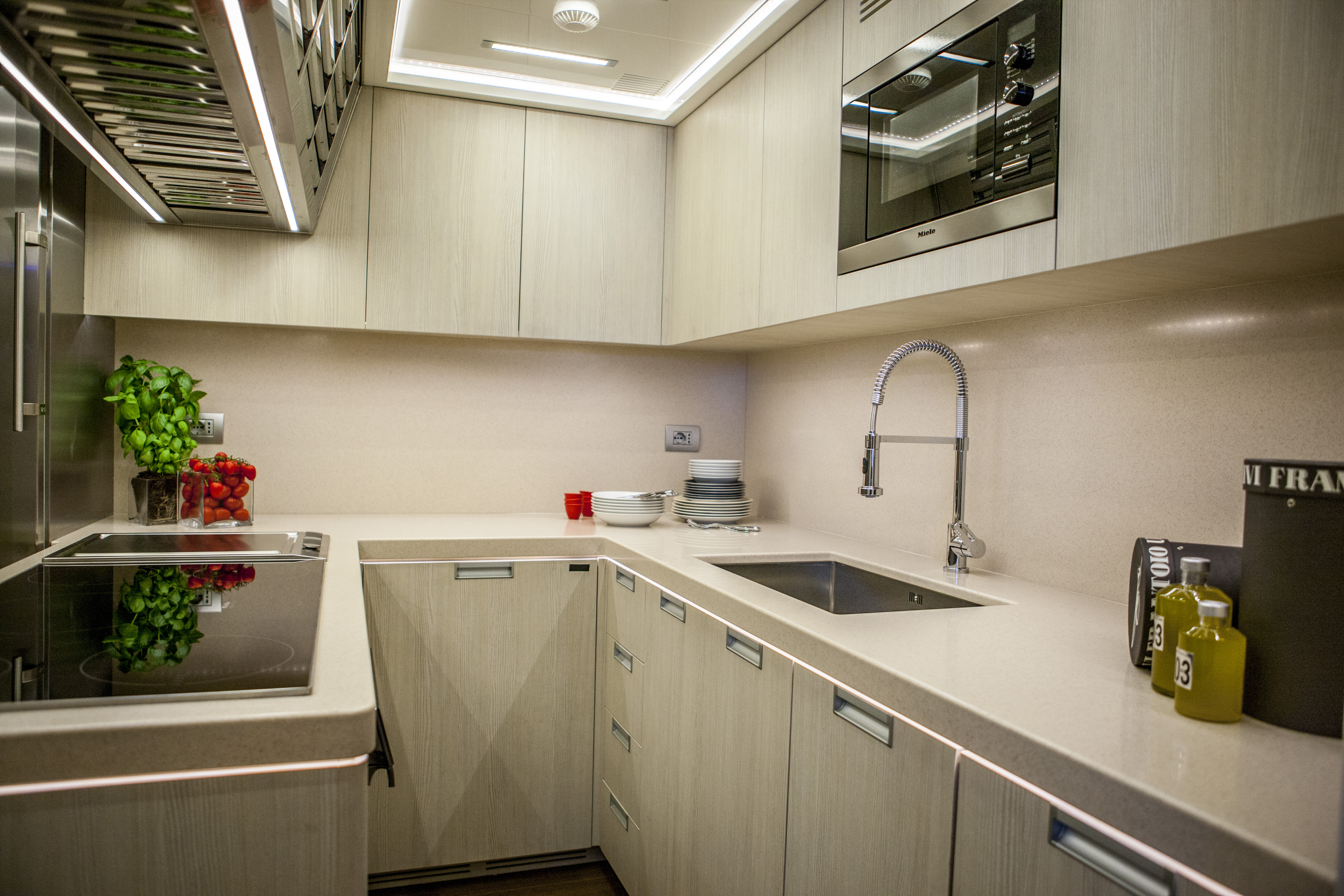 Moving onto the upper deck we reach the very welcoming salon where the 80’’ high-definition TV display can be enjoyed from the extremely comfortable sofas.