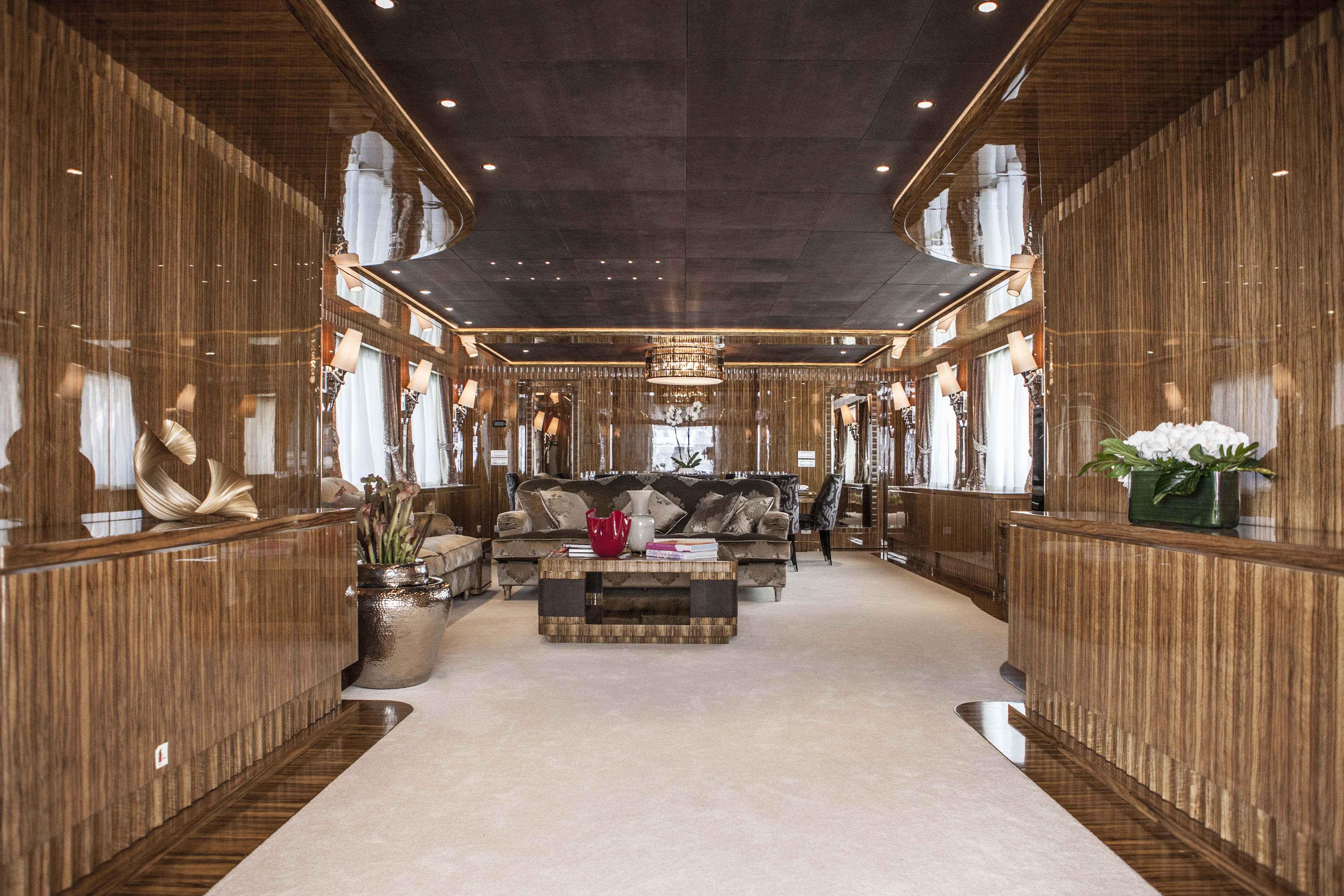 Frakè wood and galusha leather ceilings, precious marble, custom-made furniture like the marvellous dining table, skilfully inlaid with a floral pattern, can be admired all over the luxury yacht OKKO.