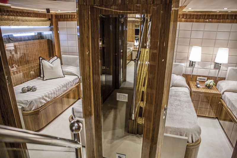 The open-space salon and dining area are in the warm coloured and welcoming aft zone with a spectacular view through the large windows. Comfort and relax are guaranteed by three very large sofas.Further in the guests will reach a beautiful stairway with a scenographic appeal, joining the lower deck with the upper deck.
