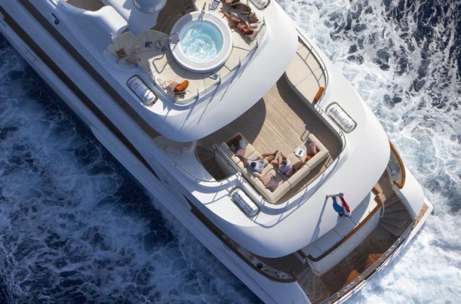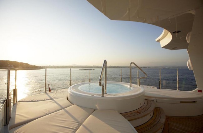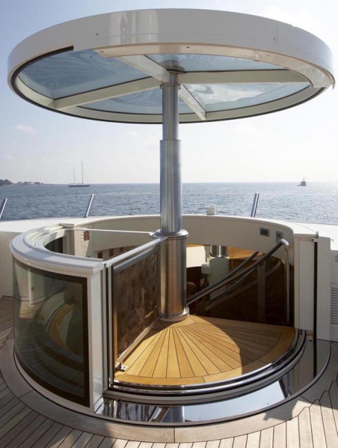 The yacht’s central feature, literally, is its central staircase running from the accommodations deck to the sun deck. It is encompassed by a mirrored atrium, and topped by an opening skylight that gives access to the sun deck. Equally important, it allows a column of daylight to brightly fill the yacht’s heart. Thus, the main- and bridge-deck saloons, surrounded by windows and doors on three sides, benefit from light pouring in on the fourth (forward) side, a rare feature in any yacht.