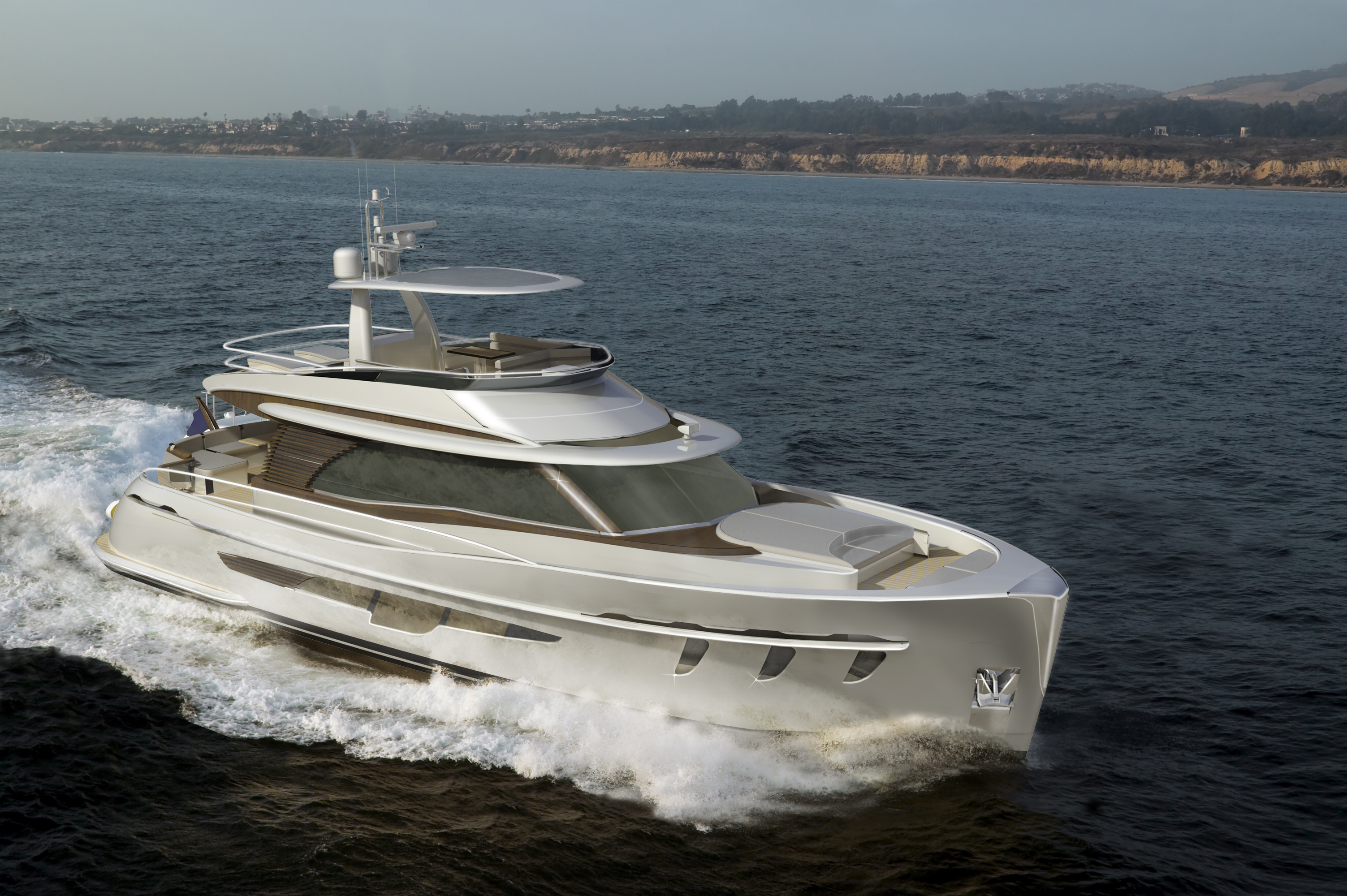 This round bilge semi-displacement motor yacht has a modern sculpture embellished by classic details like rounded windows, various wooden elements and a polished stainless steel nose being a real eye catcher. Also the shark teeth windows in the bow give the impression that she bites herself through the waves, making sure nothing gets in her way. The sun cap gives the illusion that it hovers around the superstructure, causing an angelic effect. Also the joint ventilation and hull ports emphasize the smooth lines of this Vripack design.