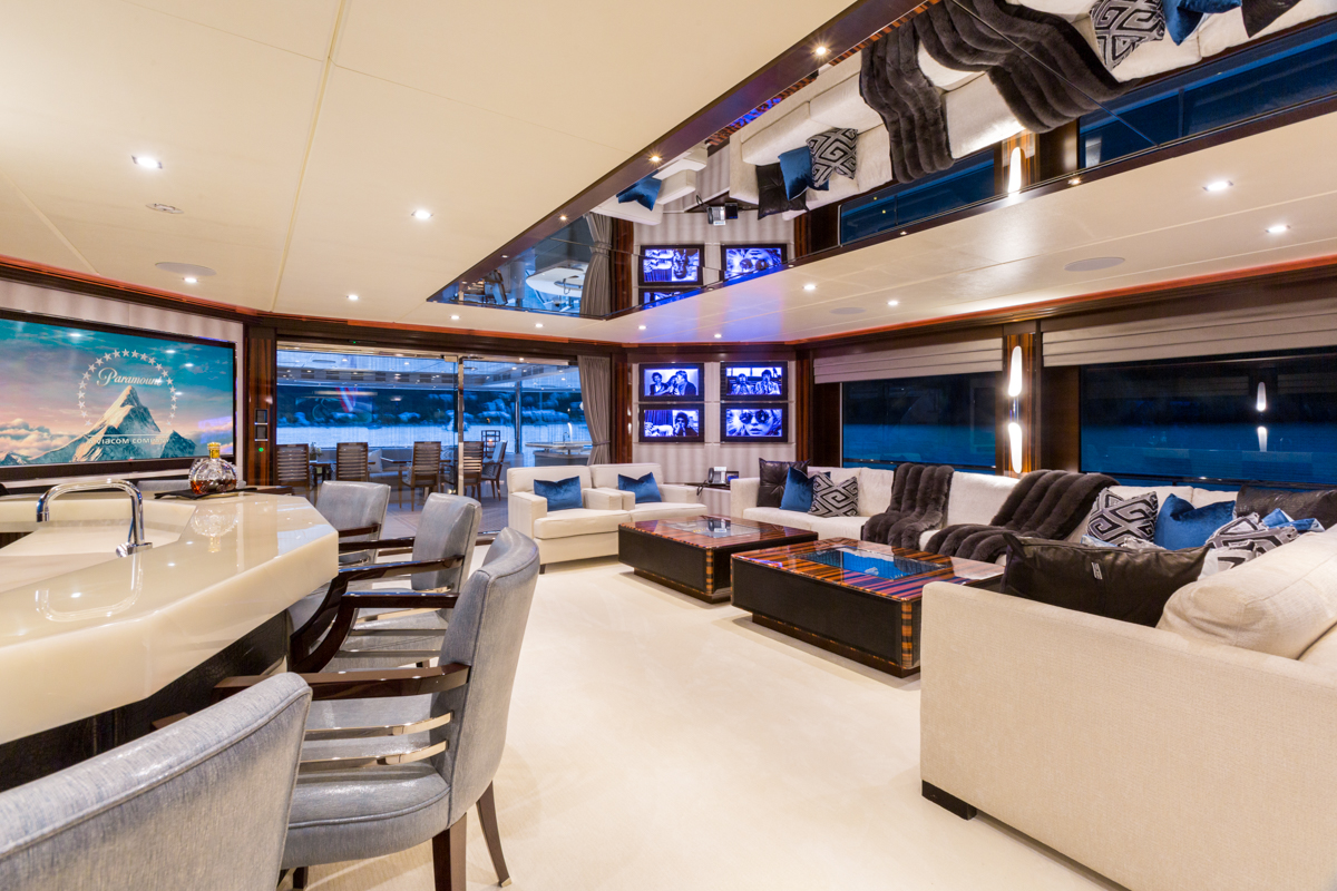 The extended swim platform provides easy and safe access to the water. There is an extensive selection of water toys available for kids and young at heart to enjoy water activities. After a day of water sports, guests can relax at the exterior lounge on the upper deck, which also features another beautiful alfresco dining area. The spacious seating area with umbrellas and sun pads is forward on the yacht’s bridge. Another impressive external space is the sundeck with al fresco dining, wet bar, large Jacuzzi, luxurious sunloungers, and sun pads.